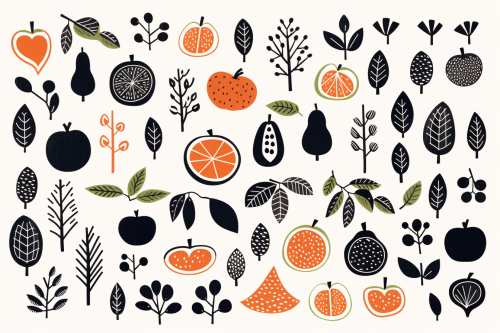 simple doodle creatures design with fruits, high quality, high resolution, black and white, label, can label, png, --ar 6:4