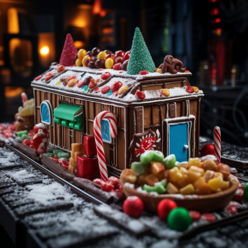 a photo of a shipping container home made of gingerbread and Christmas candy sitting on a table