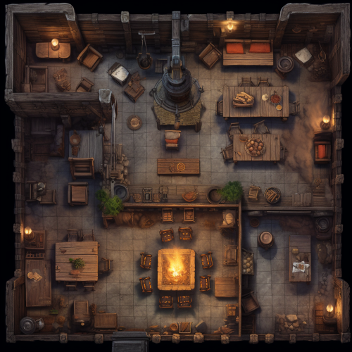 a tavern in topdown view in the style of a gridless D&D map. The tavern is ran by halflings and has a big chimney in its center where travelers can sit to warm themselves up. Some big juicy mean is being cooked on the fire.