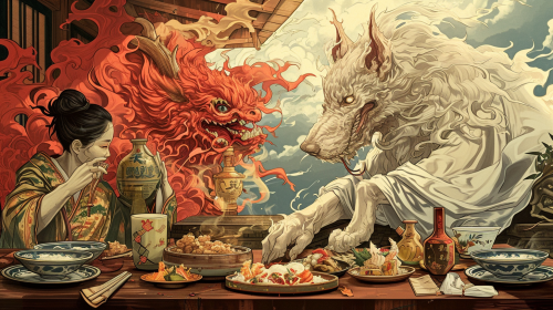 dog and human mixed daemons japanese and india cuisine --ar 16:9 --v 6.0