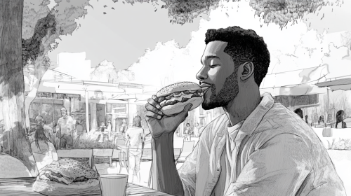 storyboard illustration of a cool black guy eating a chicken burger in a trendy urban park, concept art, storyboard, black and white, pencil drawing