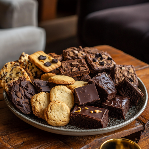 create a old big granny like plate full of homemade cookies, chocolate brownies with chocolate and caramel, presented on a big wooden table, background a livingroom