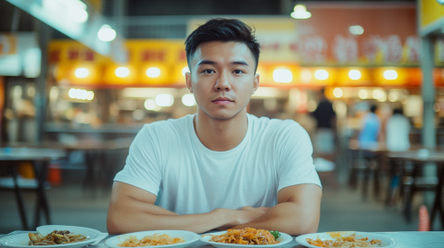 A 28 year old Singaporean man, sitting infront of a table in a hawker centre with 20 plates of Singapore good food, realistic, 35mm film photography feel --ar 16:9