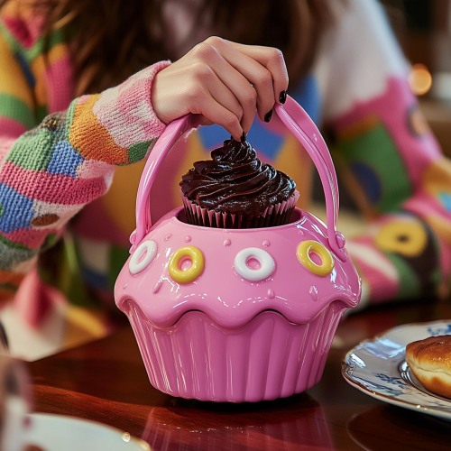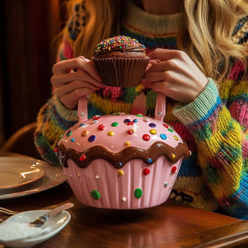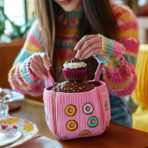 a woman pulls a chocolate cupcake out of a pink purse that is shaped like a large cupcake with a pink strap, the woman is wearing a sweater with a colorful donuts with sprinkles pattern and sitting at a dinner table
