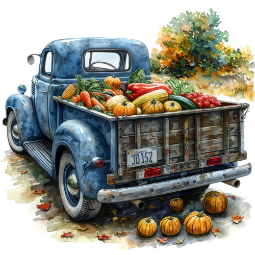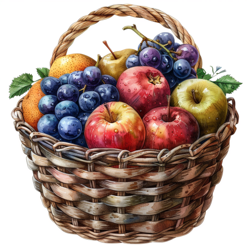 hand illustrated, watercolor style, of a basket filled with various fall harvest vegetables and apples, grapes, pears, or other seasonal fruits, adding a touch of freshness and abundance to Thanksgiving designs. clipart, isolated on white background --v 6.0 --s 750