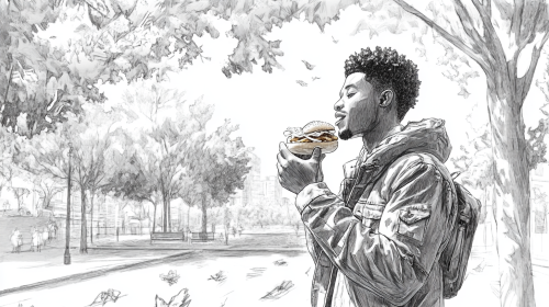 storyboard illustration of a cool black guy standing and eating a chicken burger in a trendy urban park, concept art, storyboard, black and white, pencil drawing