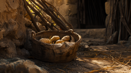 give me a cinamatic photo of a basket sitting on the ground. Inside the basket are five small peices of bread and two fish outdoors bible time period hyper realistic cinematic lighting 🎲 RANDOM 🎲 --ar 16:9 --v 6.0 --style raw