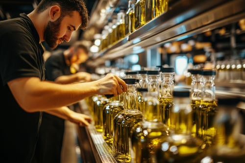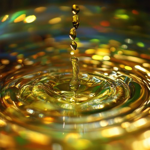First Golden Drops of Olive Oil A macro shot captures the thick, golden-green drops of oil trickling down from the press into a pristine, silver basin, each droplet rich in color and texture.