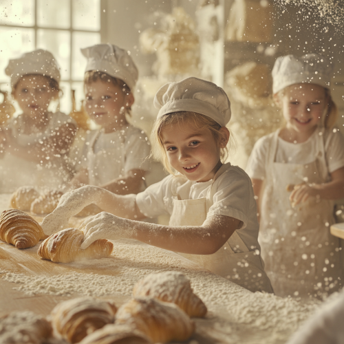 Cinematic shot of children dressed as bakers, enthusiastically making croissants. Flour floats in the air, adding a soft, magical haze to the scene. The children wear classic baker hats and aprons, with expressions of joy and focus as they knead dough and shape croissants. The setting is a bright, airy bakery kitchen with warm natural light flooding in, illuminating the floating flour particles for a dreamy, enchanting effect.