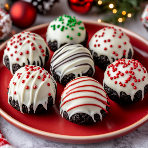 Create an image of Christmas-themed Oreo Balls arranged on a festive red plate. Each ball should be coated in smooth, white chocolate with a drizzle effect, allowing some dark Oreo filling to peek through at the bottom. Top each Oreo ball with colorful holiday sprinkles in red and green to capture a festive look. The background should evoke a cozy holiday atmosphere, perhaps with soft, warm lighting or subtle holiday decorations. Ensure the Oreo Balls have a glossy, appetizing appearance, showcasing their rich and creamy texture