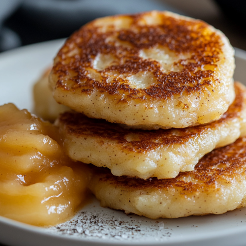 Create a close-up image of crispy, golden-brown potato pancakes on a white plate, paired with a smooth applesauce side. The potato pancakes should be textured with visible crispy edges and a well-browned exterior. Show at least four pancakes stacked or laid out, with the applesauce adding a soft contrast in color and texture on the side. Display the title 'Potato Pancakes' prominently, with an ingredients list beneath including: '4 large potatoes, peeled and grated, 1 small onion, finely chopped, 2 eggs, 1/4 cup all-purpose flour, 1/2 tsp salt, 1/4 tsp black pepper.' The setting should feel warm and inviting, perfect for a comforting homemade meal
