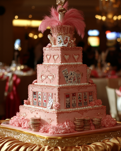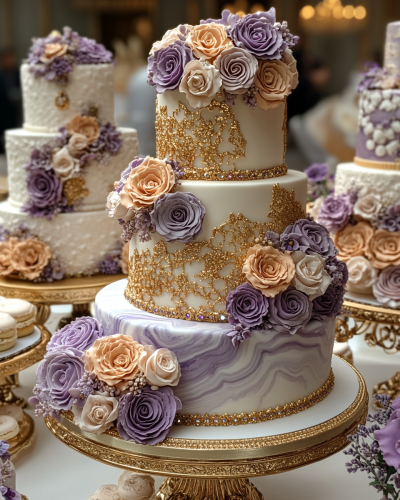 Create a beautiful and festive tall multi tiered Christmas themed cake. The cake base is fondant that has a marbleized design using bright white and green and red and gold colors. Geode design style. Gold Royal icing filigree and paisley and swirls designs. Baby red and white roses. Spruce pine tips. Small red poinsettias. Holly leaves and berries. Gold candy baubles. Candy cane swirls discs. Red ribbon bows. Thin fondant swags. Buttercream icing. This cake sits on a tall pedestal cake stand in gold. This is a Christmas wedding and party at a banquet hall. There are spotlights on the cake and curtains in the background.