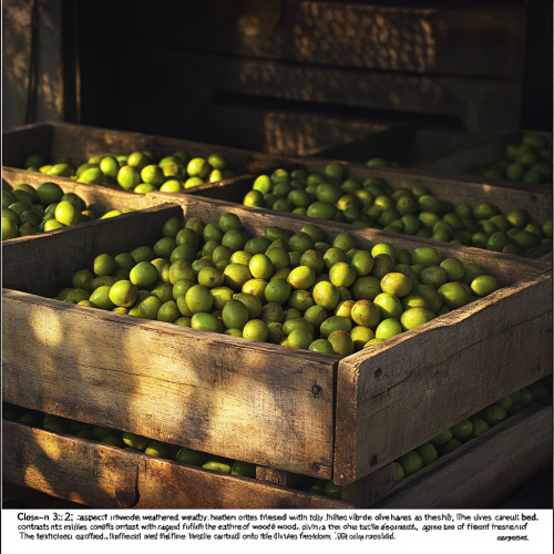 "Close-up in 3:2 aspect ratio of weathered, wooden crates filled with freshly harvested, vibrant green olives as they’re carefully lifted onto the truck bed. The texture of the olives contrasts with the earthy, aged wood, giving a tactile sense of freshness and authenticity. This shot uses a soft focus on the background, highlighting the olives and crate textures under a warm, golden light. Every detail feels deliberate and crafted, enhancing the visual appeal for a high-end, teaser-style scene."