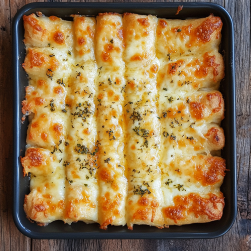 Create an image of a baked chili cheese dog casserole in a glass dish. The casserole should feature sliced hot dogs nestled in a thick layer of chili, topped generously with melted cheddar cheese, giving it a gooey, golden-brown look. The hot dogs should be partially visible, poking through the melted cheese, while the edges of the cheese have a slightly crisp texture. Ensure the dish looks warm, hearty, and indulgent, capturing the texture and richness of the melted cheese over the savory chili and hot dogs
