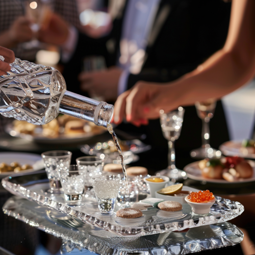 A close-up of a premium vodka-tasting presentation, with clear vodka being poured into crystal shot glasses on a stylish tray. The table includes small plates with luxurious finger foods like caviar blinis and artisan cheeses. Crisp, cool tones and subtle lighting reflect off the glassware, adding a sense of class. Background shows silhouettes of people in suits and elegant dresses, all engaged in conversation and enjoying the sophisticated atmosphere. photorealistic, Canon EOS 5D Mark IV DSLR, f/5.6 aperture, 1/125 second shutter speed, ISO 100 --v 6.0 --s 50