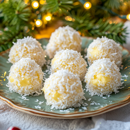 Create a festive, close-up image of Pineapple Christmas Balls arranged on a plate. Each ball is coated in sweetened shredded coconut, giving a snowy, wintry appearance. The balls should look creamy and slightly textured, with a golden tint showing hints of crushed pineapple and graham cracker crumbs inside. Set the plate against a holiday-themed background with blurred Christmas lights and green pine branches for a cozy, seasonal feel. Include a small title at the bottom reading 'Pineapple Christmas Balls,' and list ingredients briefly: '1 1/2 cups crushed pineapple, 2 cups crushed graham cracker crumbs, 1 cup shredded coconut.' Capture the essence of a sweet, tropical holiday treat with a snowy appearance