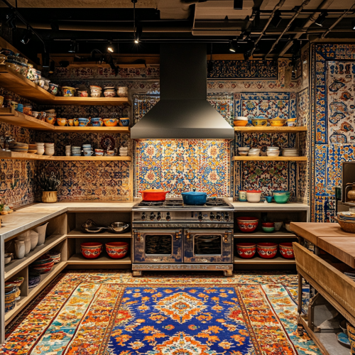 A wide-angle shot showcasing the entire kitchen, featuring the Persian-inspired pot on the stove. The background displays hand-painted wall tiles with traditional motifs, open wooden shelves with Persian ceramics, and a richly patterned Persian rug. The ambiance is warm and inviting, blending cultural artistry with a functional cooking space.