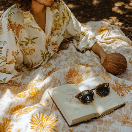 summer themed editorial, minimal beach towel tablescape, close up view of a picnic blanket, with a person wearing a hawaiian shirt, don't show the face, fashionable product shot of sunglasses sitting front and center, table setting featuring a coconut and a book