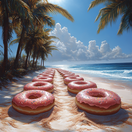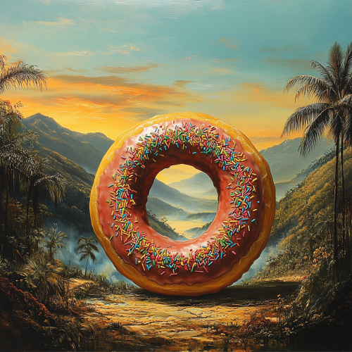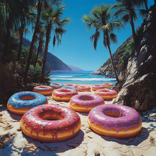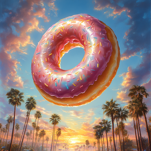 Picture a large donut floating in the sky with a rainbow gradient icing, hovering above a grove of tall, green palm trees. The background features a clear, blue sky with a few wispy clouds, giving a dreamy, almost fantasy-like effect as if donuts are part of the natural landscape. --s 750