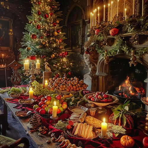 a great giant of a man in red fur robes with an equally great cornucopia of food and drink in a hall with a fire place with candles and writhes adorned all about --s 50 --v 6.0 --style raw