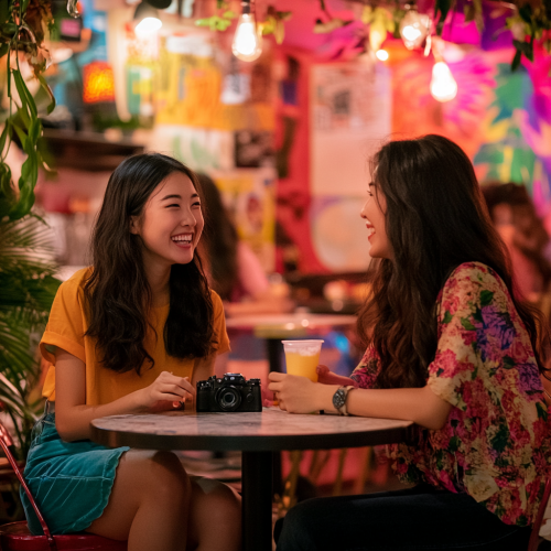 Setting: The scene transitions to a vibrant café filled with colorful decor and fairy lights. Friends are seated at various tables, enjoying drinks and snacks, creating a warm and lively atmosphere. Focus on Vivian: • Physical Appearance: • Vivian Chen is seated at a small table with her best friend Eesha. She has changed into a bright, casual t-shirt, and her camera rests on the table, signaling her comfort in this space. Her expression is more relaxed, showing a hint of a smile as she engages in conversation. Focus on Eesha: • Physical Appearance: • Eesha, her best friend, has long, dark brown hair styled in loose waves, wearing a bohemian-style blouse paired with skinny jeans. Her brown eyes sparkle with enthusiasm as she gestures animatedly, embodying her supportive and vibrant personality. Actions: • The two friends lean in toward each other, laughing and sharing snacks. Eesha is animatedly encouraging Vivian, her hands emphasizing her words as Vivian listens intently, her expression softening.