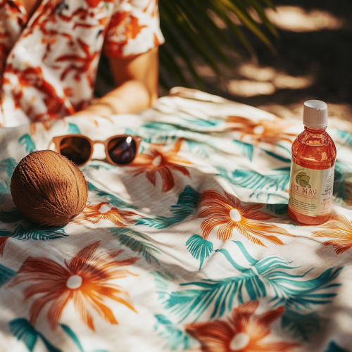 summer themed editorial, minimal beach towel tablescape, close up view of a picnic blanket, with a person wearing a hawaiian shirt, focus on the torso area, fashionable product shot of sunglasses sitting front and center, table setting featuring a coconut and a bottle of sunscreen