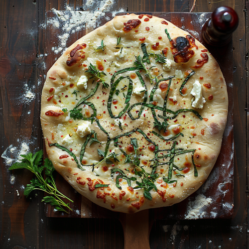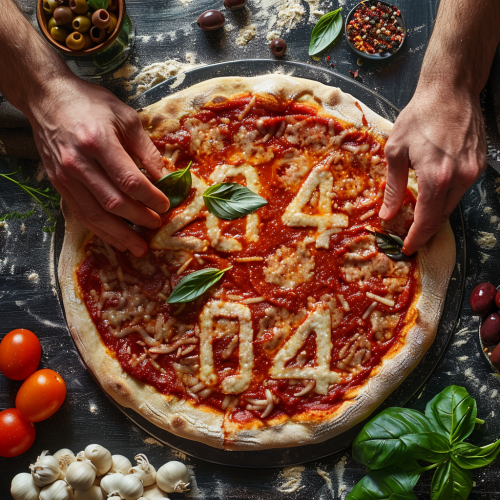 Top-down view of a wooden board dusted lightly with flour, featuring a rustic pizza dough with '2014' artfully spelled out using fresh herbs, mozzarella cheese, and spices. The setting emphasizes an artisanal, handmade approach, capturing the essence of a classic pizza-making process. Soft, warm lighting highlights the texture of the dough and ingredients, evoking a cozy, traditional pizzeria vibe. Highly realistic and detailed --v 6.0 --s 250 --style raw