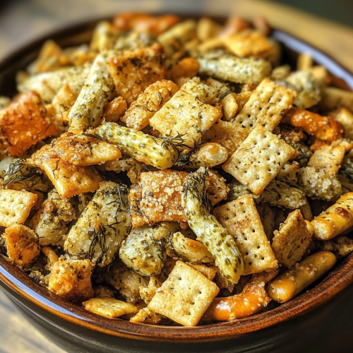 A close-up shot of a bowl filled with a homemade Dill Pickle Chex Mix snack, featuring Chex cereal pieces, pretzel sticks, and a light coating of dill seasoning. The cereal and pretzels are lightly golden and crispy, with a hint of herbs and spices visible on the surface. The snack mix looks crunchy and flavorful, with a rustic, appetizing appearance. Soft lighting in a cozy kitchen setting, shallow depth of field, vibrant yet natural colors, highly detailed