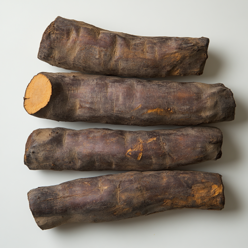 On a white background, five long wild yams are stacked horizontally, overlapping each other. Two of them have cut ends. The surface is rough and textured, with a brown color. --s 250