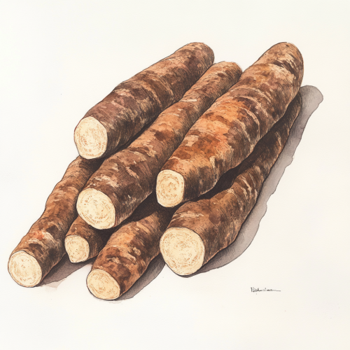 A watercolor drawing on a white background shows five long wild yams stacked side by side, overlapping each other. The surface is rough and textured, with a brown color. --s 70