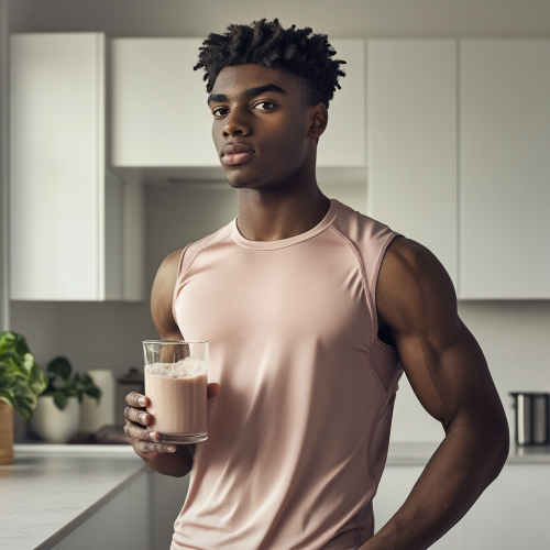 Hyperrealistic photography of young people with a glass of smoothie, with a sports shirt, neutral background, bodybuilding, kitchen, looking forward, happy