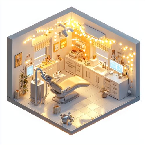 Isometric 3D Model of A Dental clinic, Christmas atmosphere inside the miniature scene, white background, light strip decoration on windows and doors, warm lights hanging from the ceiling. flooded with orange juice --q 2