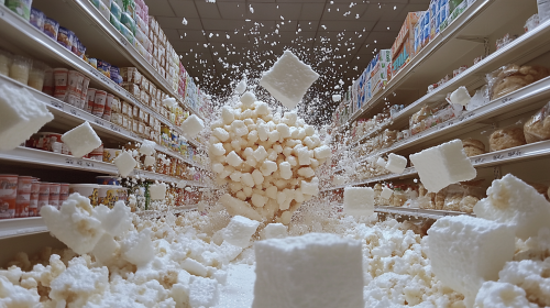 someone stuck in a gooey selfie moment melted marshmellows and krispie squares all around in a supermarket pretending to be stuck epic show display --ar 16:9 --v 6.1
