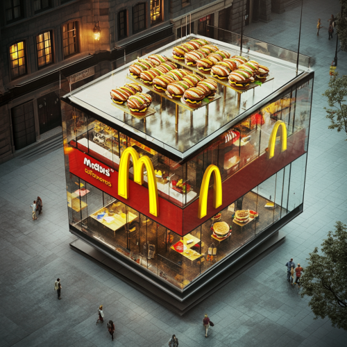 MCdonald's store located in the middle of the square. On the roof only arranged lots of McDonald's sandwiches in 3D and the whole thing is surrounded by a glass window.