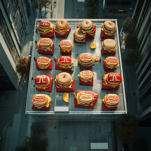 MCdonald's store located in the middle of the square. On the roof only arranged many huge 3D McDonald's sandwiches and the whole thing is surrounded by a glass window. Photo taken from below at human height.