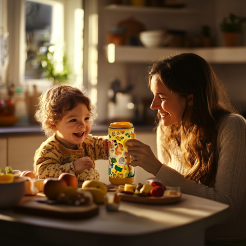 Cozy kitchen scene in the morning with a mother and young child having breakfast. The child is holding a vibrant, kid-friendly thermos cup with playful characters, while the mother smiles warmly. The kitchen is well-lit with natural light streaming through a nearby window, giving the space a soft and inviting atmosphere. The table has a mix of breakfast foods and fruits, with a focus on the child’s joyful expression and the colorful thermos. Soft, inviting colors, high detail, modern kitchen design –– photorealistic, warm and cozy.
