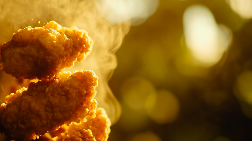 Advertizing photography, chicken nuggets, close-up shot, Canon EOS R5, ambient light, modern setting, indoor, sunny weather, serene mood, Stanley Kubrick style, 2020s, #EAEAEA --ar 16:9 --style raw --s 50