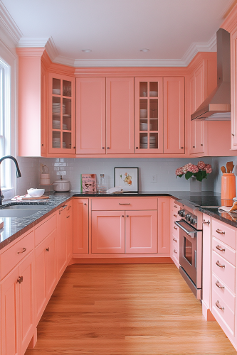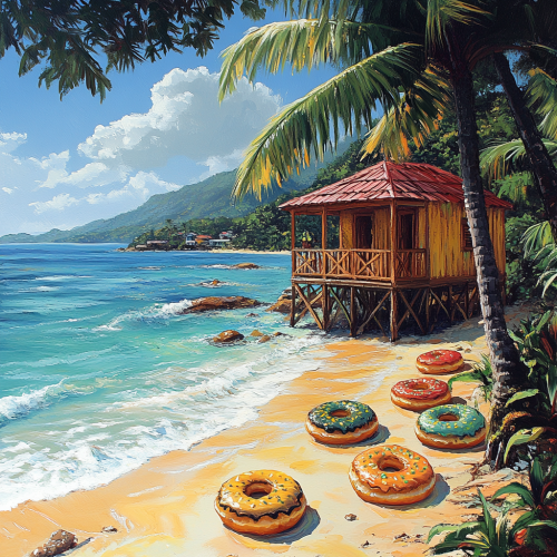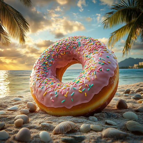 A large donut with pink, yellow, and green icing is positioned in front of a Jamaican sunrise on a beach, with the morning sky casting a beautiful glow over the scene. Palm trees sway on either side of the donut, and the sand features natural beach stones and seashells that emphasize the Jamaican beach experience. --s 750