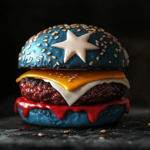 recreate a burger with a blue top bun, a slice of white melted cheese, a red beefy patty, a second slice of white melted cheese, and a red bottom bun, a white star is seared into the top bun, sesame seeds on the bun