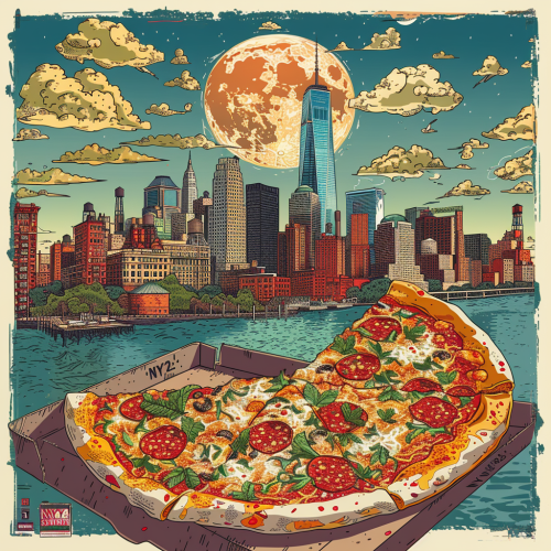 A realistic, high-resolution shot captured by a Nikon Z100, showcasing a large, thin-crust pizza inspired by New York-style and Lahore flavors. The pizza is topped with a blend of classic ingredients like mozzarella and pepperoni, alongside Lahore-inspired toppings like spicy chicken tikka and tangy chutney, creating a unique fusion. The pizza rests on a rustic wooden table, with the background softly focused to reveal an imaginative fusion cityscape combining New York's iconic skyscrapers and Lahore's historic architecture, symbolizing the brand's cultural blend. Warm, natural lighting accentuates the textures of the cheese, crisp crust, and fresh toppings. The overall setting feels inviting and authentic, evoking the essence of Ny-212 Pizza’s origin story and its pizza revolution in Lahore. The high-quality Nikon capture brings out detailed textures, colors, and depth, offering a lifelike, appetizing scene --v 6.0 --s 250 --style raw