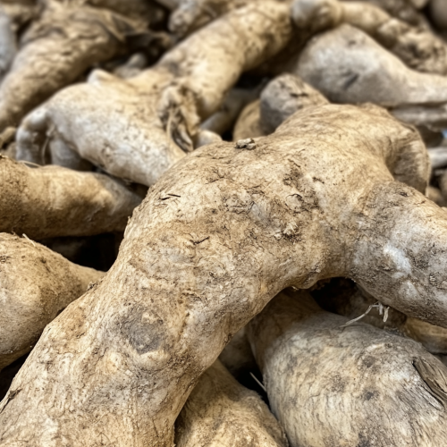 A pile of wild yam roots. In the foreground, there is a large root, with several smaller roots behind it. The roots have a rough, textured surface, with a light brown or beige color. --s 250