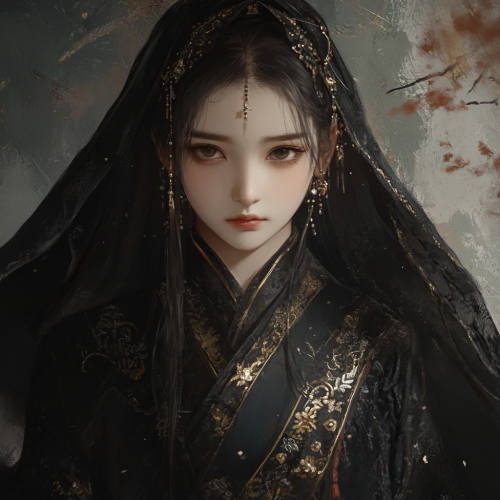 A 14-year-old ancient Chinese girl with a firm face, brown hair, chestnut eyes, and a pointed face without freckles. She was wearing an exquisite Tang costume, a long black cloak embroidered with delicate patterns, and black shoes embroidered with intricate patterns. The girl held a delicate umbrella, combed her delicate hair, and the sky was raining softly.