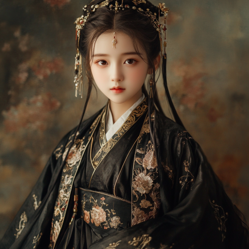 A 14-year-old ancient Chinese girl with chestnut colored hair and eyes, a pointed face without freckles, wearing an exquisite Tang costume and a black one embroidered with delicate patterns in gold thread, walked from a distance. To showcase the whole body.