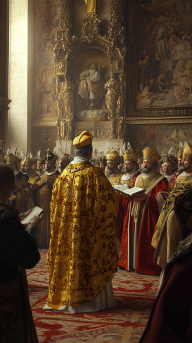 The total annihilation of the Order of the Temple was agreed, a solemn moment with church officials signing a decree, 14th century, cardinals and bishops in red and white robes, a large wooden table with parchment documents, dim candlelight illuminating the scene, medium shot, hyper-realistic, photo realism, cinematography --ar 9:16