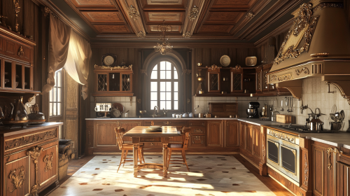 imagine a kitchen from 18th century classic style, wooden design ceiling, crown wall, realistic render, chimne, window, chimney table in the centre filled with kitchen items cear light nice visibility --ar 16:9 --v 6.1