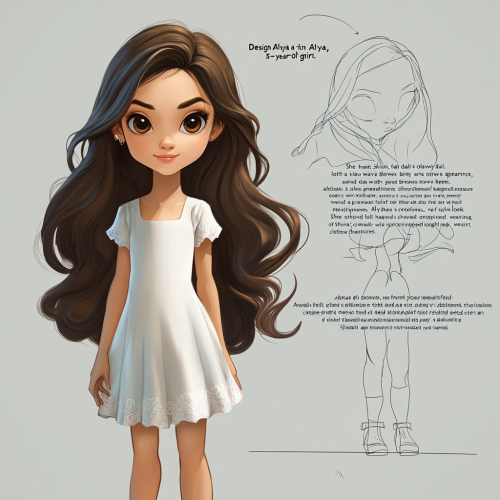 "Design Alya, a 5-year-old Arab girl. She has fair skin, long wavy brown hair, and dark brown eyes. Alya is tall for her age, with a graceful appearance and always full of ideas. She should have a creative, inspired look, wearing clothes that are bright and fun."