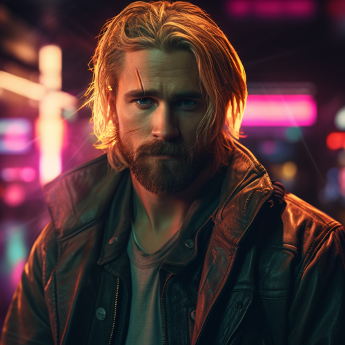 It's a rainy day in 1946, inside a store with a rainsoaked window with lights from a busy city street shining through. A beautiful 22 year old brunette with blue eyes is reading a book with a cup of coffee sitting on the open book, which is laying on a counter. A 30 year old man, with brown hair and green eyes, is standing a few feed from this woman. She's ignoring him, concentrating on her book, annoyed with his attention. Dark palate with bright color highlights. --ar 3:2 --v 6.1