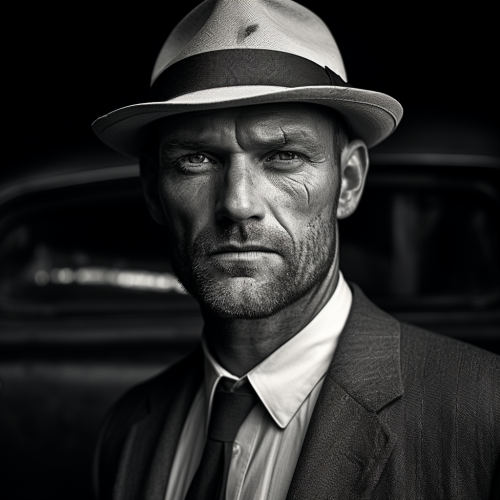 b&w portrait of muscular ex-boxer man in his 30s who is currently working as chauffeur. He is wearing a suit and trilby hat. He is ugly - has old scars on face, has cauliflower ear and broken nose. Realistic style that looks like aged photo, black and white. Stylized to look like 1920s character. Call of cthulhu.