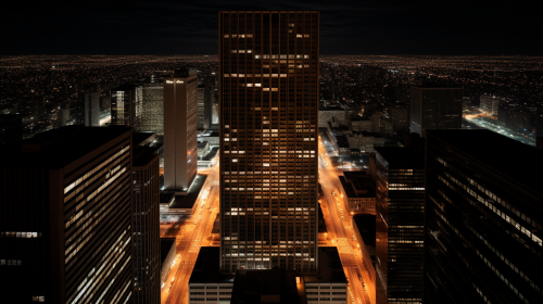 Aerial photography of a slender skyscraper in downtown Chicago. The skyscraper is dark and sinister. Designed by Oscar Niemeyer and wes anderson --ar 16:9