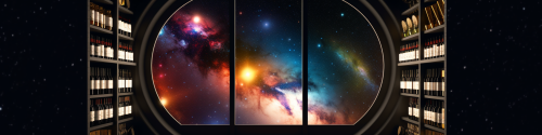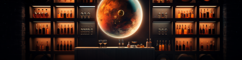 An image that represents the idea of a futuristic wine and spirits cellar. A window shows planets and galaxies predominantly orange, brown and dark colours --ar 8:2 --v 5.0